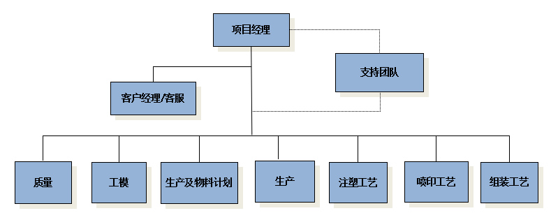 サポートチーム:全ての部門マネージャー、重要ポジション主管が含まれ、プロジェクトが必要とする資源を提供します。